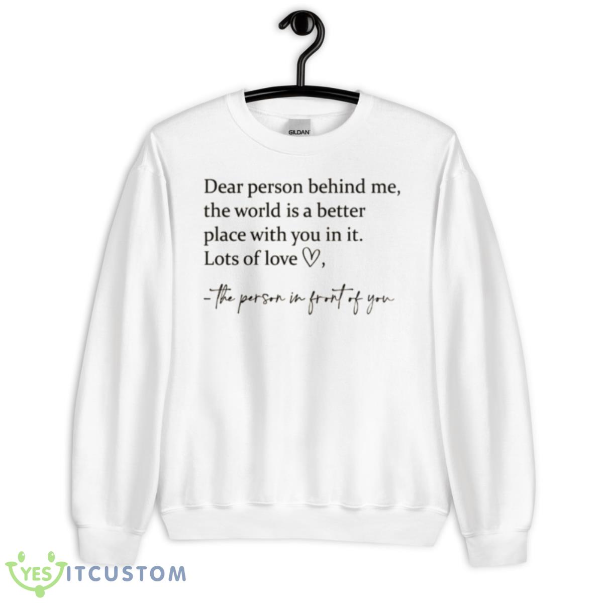 Thanks so much for considering our Dear Person Behind Me sweatshirt! We think it’s pretty great, and we hope you will too.