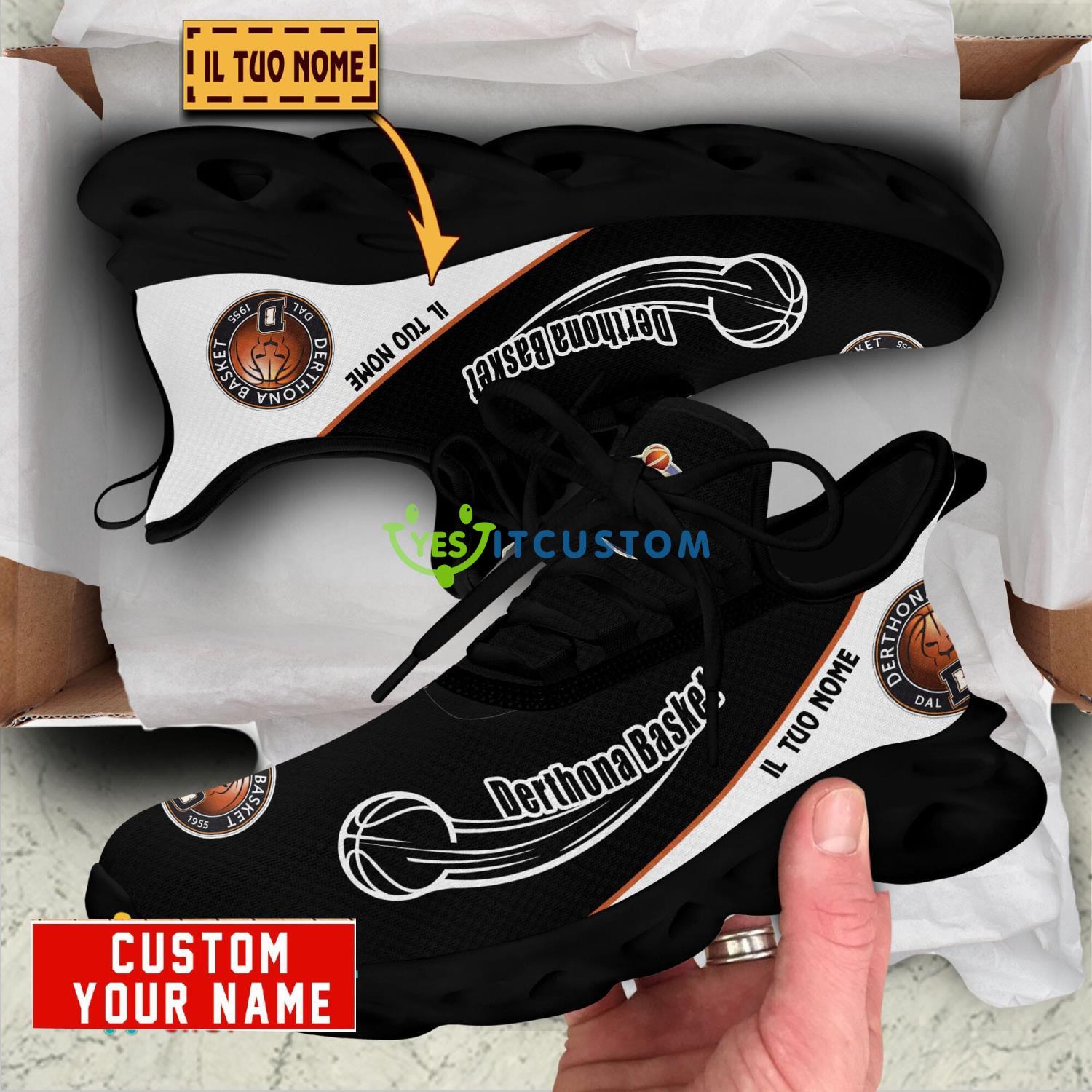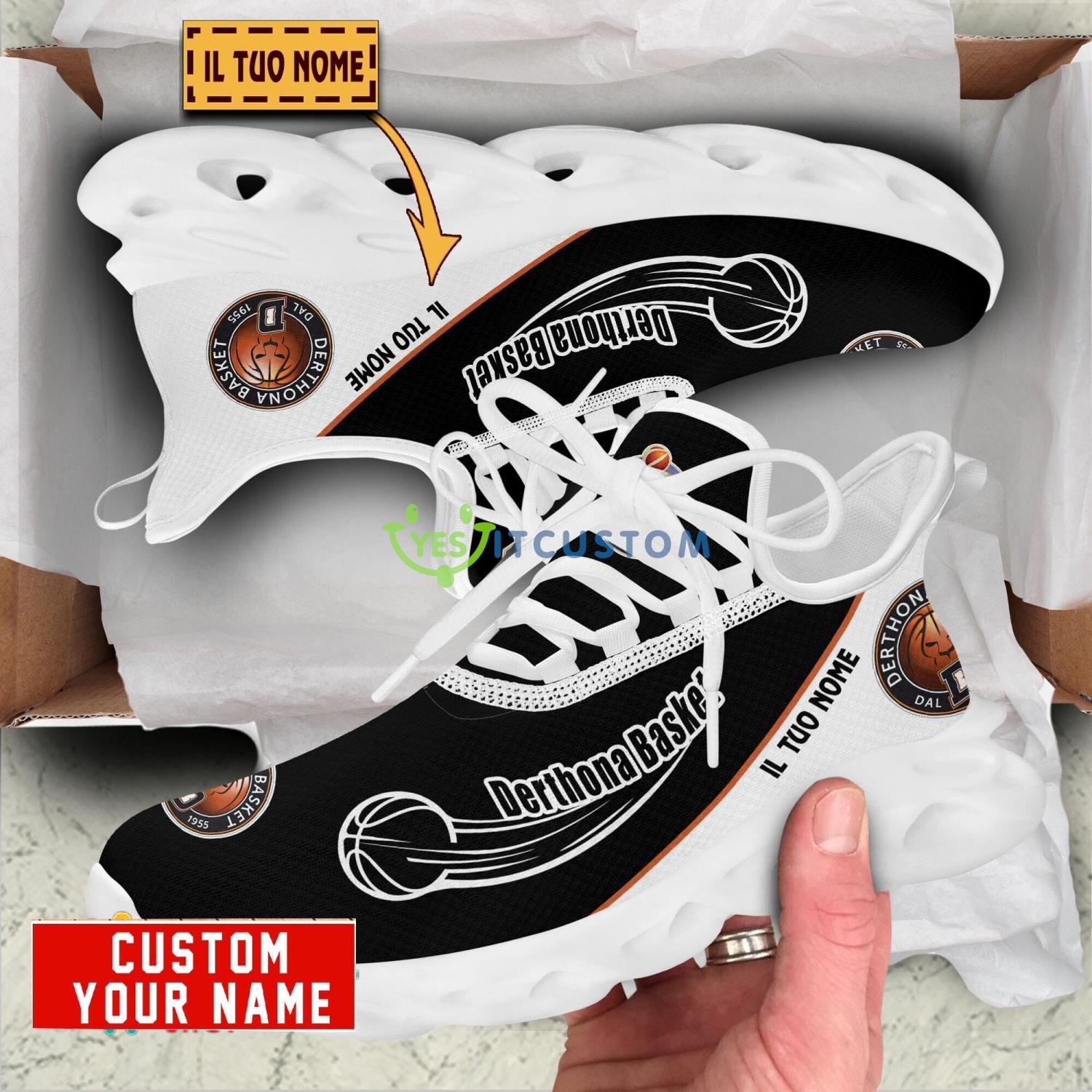 This Derthona Basket Max Soul Shoes Personalized Name Sneakers is a breathable, lightweight, and comfortable casual outdoor shoe that has a unique design. It is made of a mesh fabric which makes it sweat absorbent and breathable, while the rubber bottom ensures traction, comfort, and durability. It is available in two colors: black or white sole. There are two styles of shoelace holes so you can choose your preference.