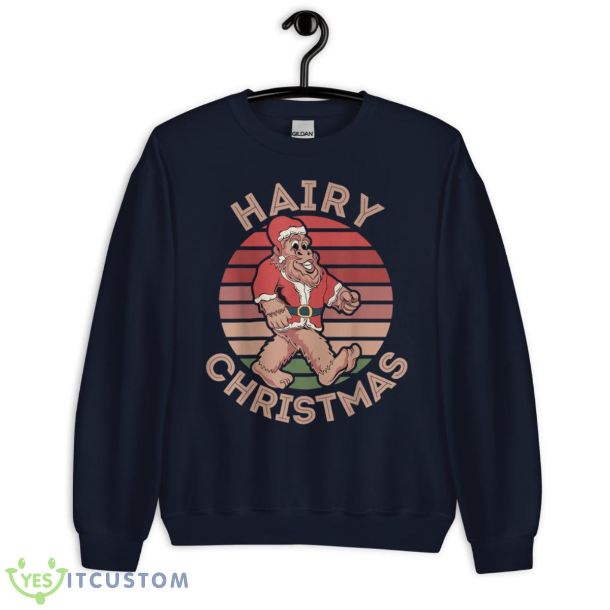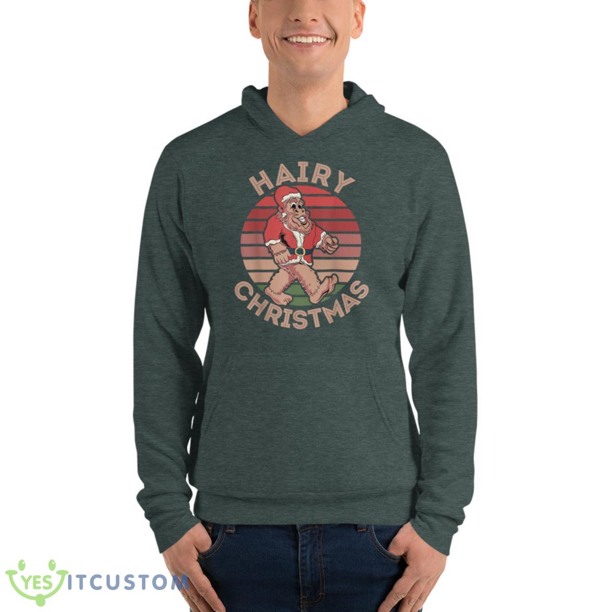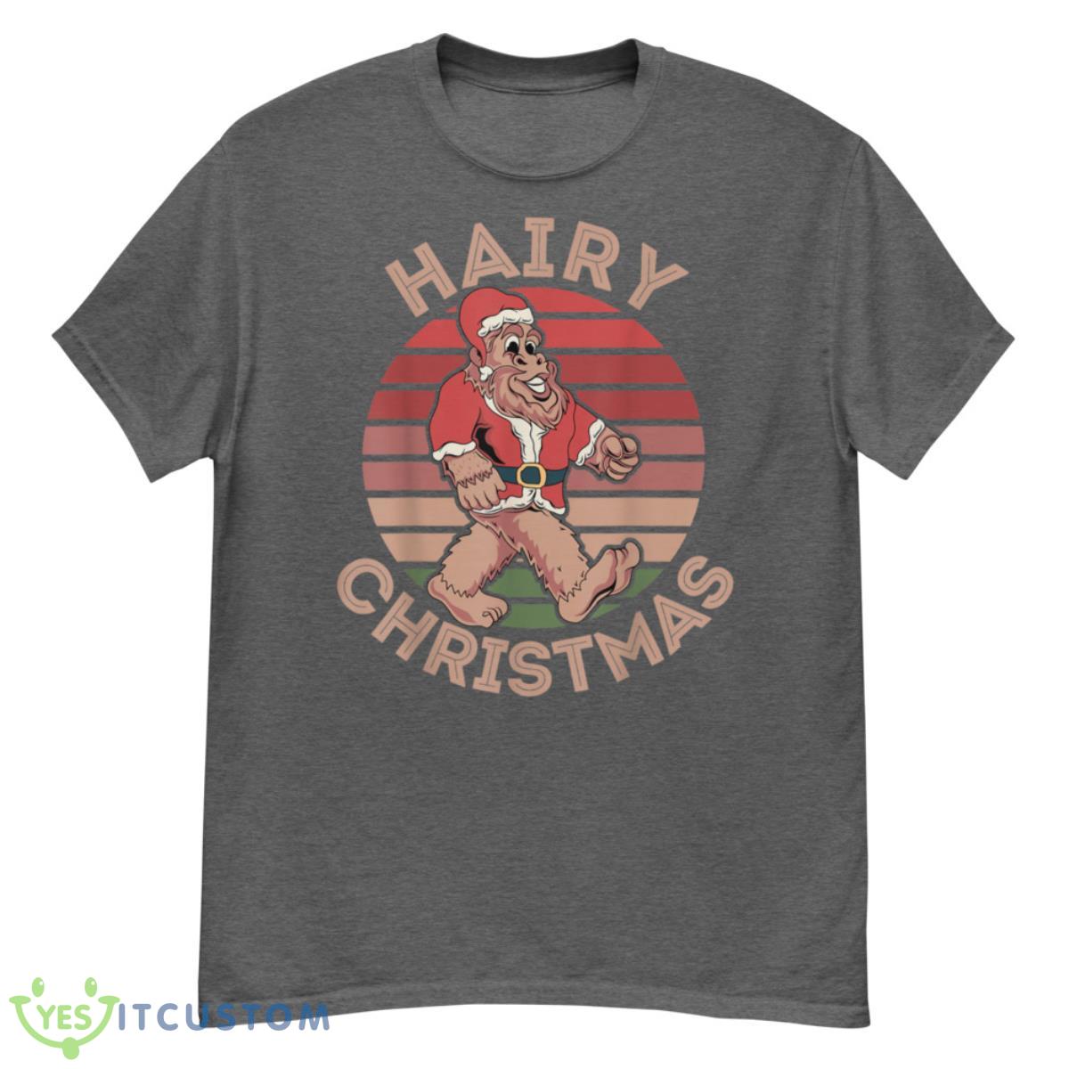 Hairy Christmas Yeti Funny Sasquatch Santa Hat Retro Sunset Shirt Details