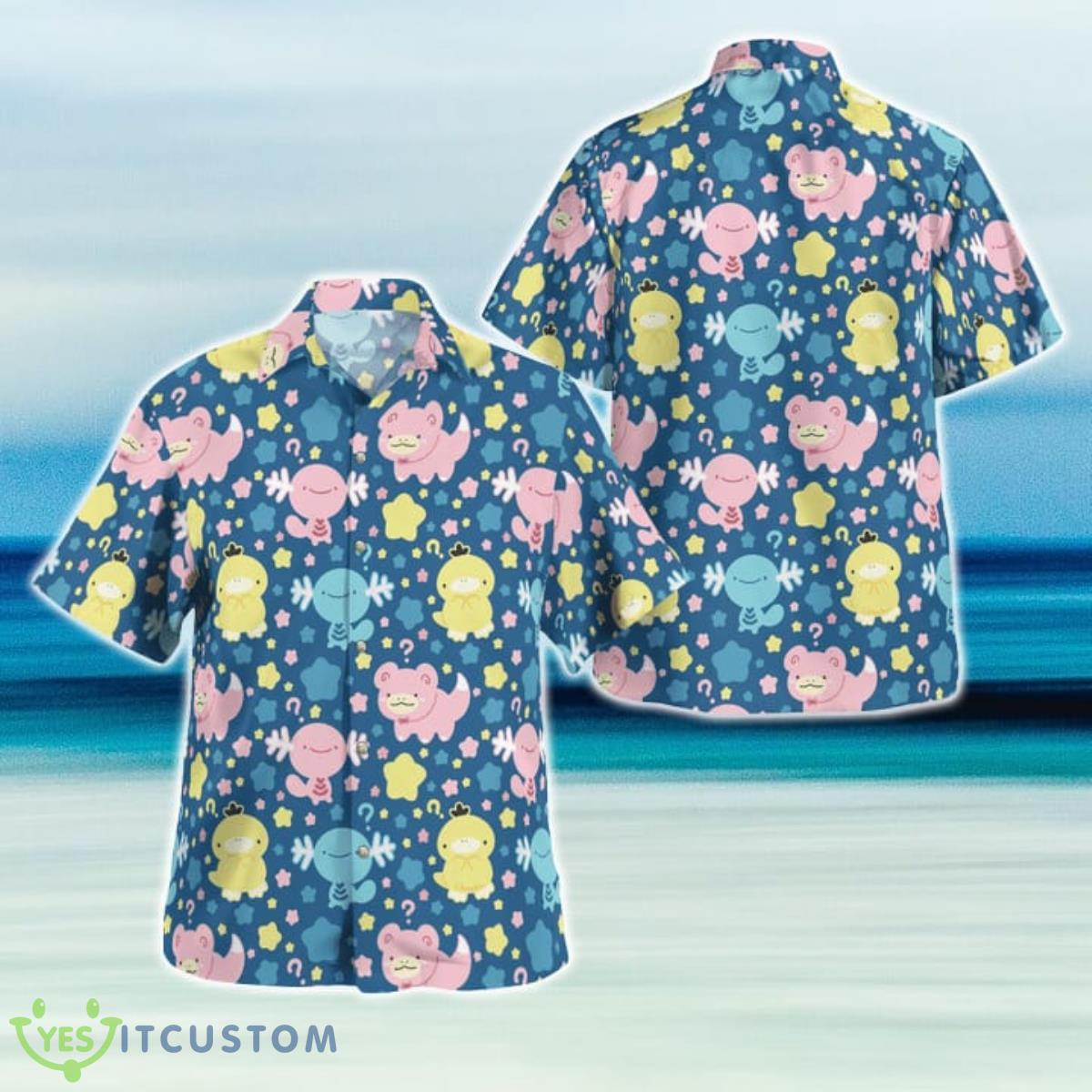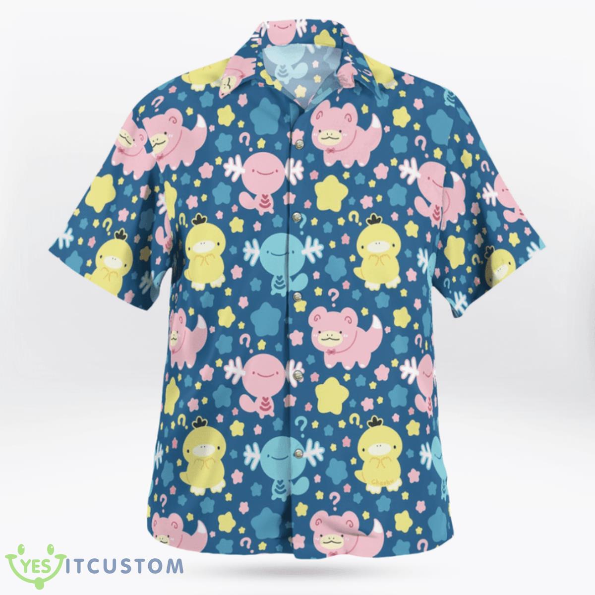 Crafted with utmost care, this Hawaiian shirt features a delightful print showcasing your favorite water-type Pokemon, Wooper and Slowpoke. The intricate design captures their playful essence, making it a must-have for any Pokemon fan. The vivid colors bring the characters to life, creating a fun and eye-catching look.