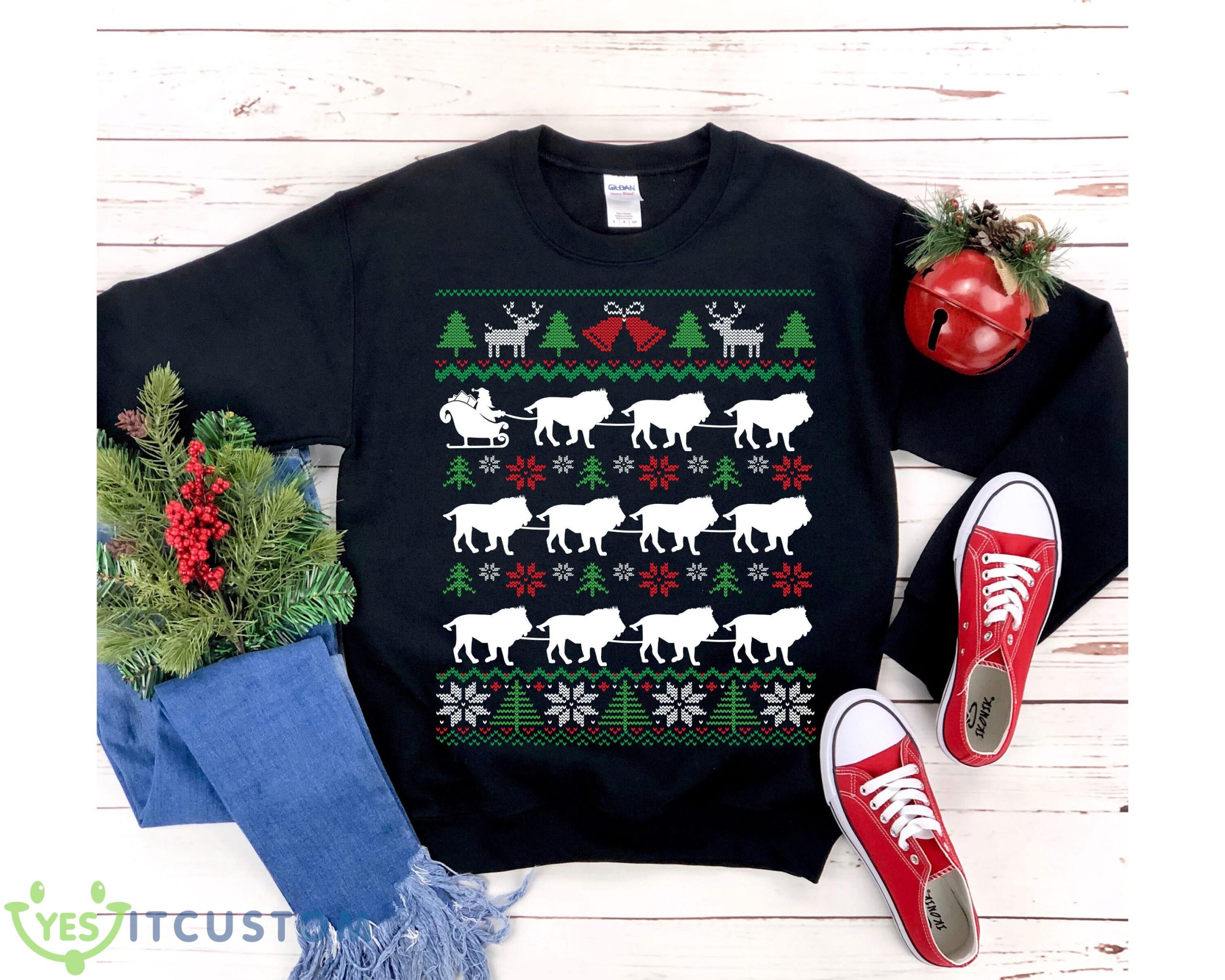 Crafted with the utmost care and attention to detail, this sweatshirt features a delightful design that will surely turn heads at any holiday gathering. The adorable lions, with their mischievous grins, showcase their strength as they pull Santa’s sleigh through a winter wonderland. This unique combination of Christmas cheer and lion-themed hilarity is guaranteed to make you the star of the party!
